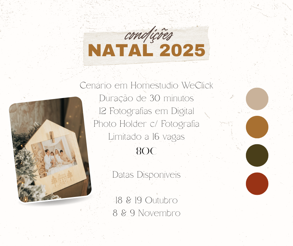 Apenas é permitida a sessão com os intervenientes a fotografar (agregado familiar); Por cada membro extra ao agregado familiar acresce um valor de 10€/pessoa (sujeito a confirmação por parte da WeClick devido à capacidade em estúdio).